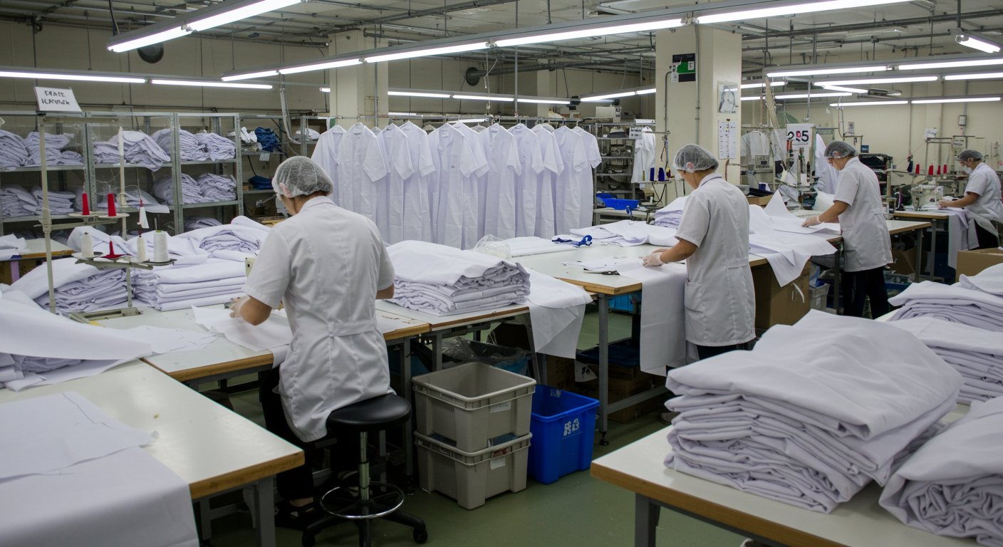 Процесс производства халатов для фармацевтов включает несколько ключевых этапов: выбор материала, кроя, пошив, обработку швов и контроль качества. Для повышения прочности применяются усиленные швы и двойная строчка, которые обеспечивают долговечность при частой стирке. В некоторых моделях используется ультразвуковая сварка или термоскрепление для герметичного соединения деталей, что исключает появление микропор и повышает защитные свойства изделий. Автоматизированные линии кроя обеспечивают точность и минимизацию отходов ткани, а контроль качества включает проверку прочности швов, посадки, цвета и устойчивости материала к химическим воздействиям.