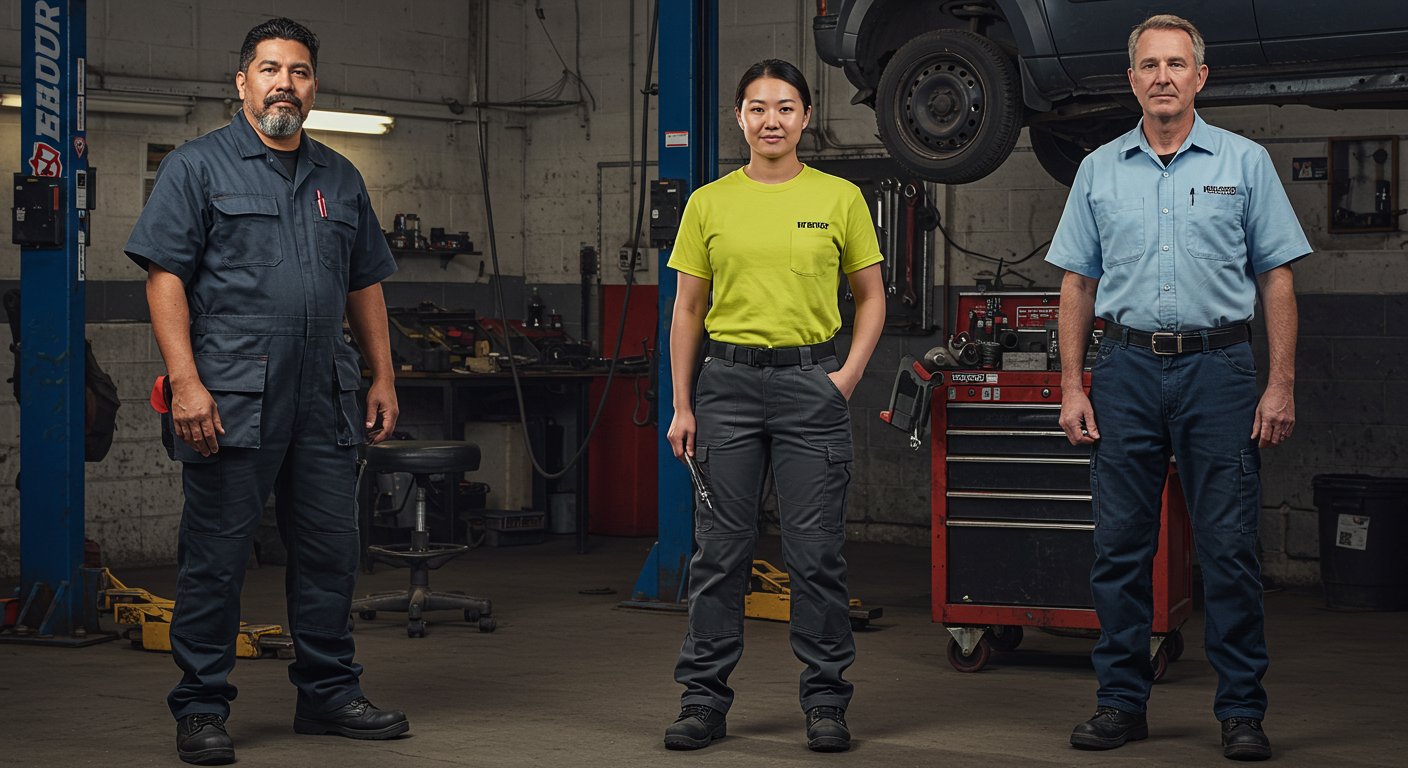 Пример современной спецодежды для сотрудников автосервиса с защитными и фирменными элементами