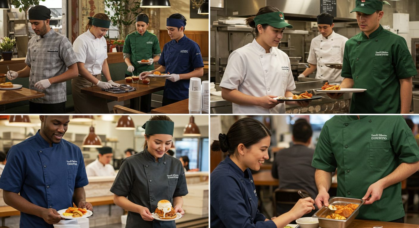 Используются закрытые куртки, фартуки, головные уборы и легко стирающиеся ткани, устойчивые к пятнам. - Можно ли использовать одну униформу для кухни и зала?